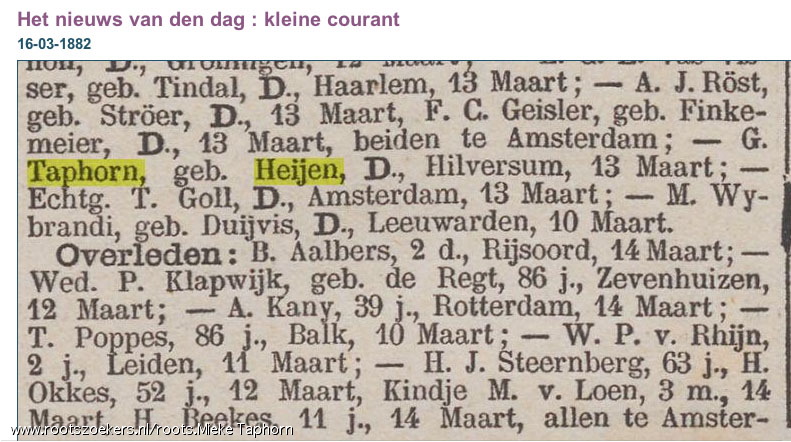 1882,Familieberichten, geboren dochter. Taphorn-Heijen